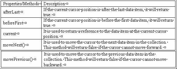 The current, afterLast, and moveNext() methods/properties are used in data traversing. The following properties and methods supported by the IViewCursor interface allow a user to move through one data item at a time and determine what should be the current cursor position: Answer option A is incorrect. The filterFunction() is used to filter an Array Collection to only show the items that match certain criteria.