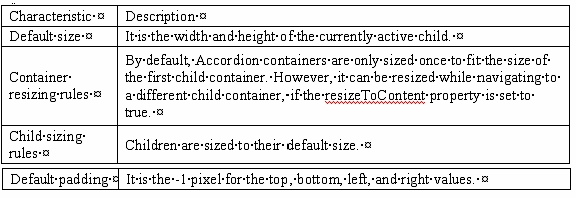 · Default size: The height of a VBox layout container is large enough to hold all its children at the default. The width of a VBox layout container is the default or width of the widest child along with left and right padding of the container. · Default padding: It has 0 pixels for the top, bottom, left, and right values. Answer option D is incorrect. Accordion is a navigator container, which shows its children containers as a series of panels. It contains a collection of child containers, however, only one of them is visible at a time. It creates and manages navigator buttons (accordion headers), which a user uses to navigate between the children. Accordion does not extend the ViewStack container; however, it implements all the properties, methods, styles, and events of the ViewStack container, such as selectedlndex and selectedChild. An Accordion container has the following default sizing characteristics: Answer option A is incorrect. ViewStack is a container that contains other child containers stacked on top of each other like a deck of cards. It consists of a collection of child containers stacked on top of each other, where only one child at a time is visible.