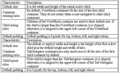 When the user selects different child containers, the ViewStack container gives the impression of replacing the old one because a new child container appears in the same location. The sizing characteristics of the ViewStack container are follows: Answer option C is incorrect. The TabNavigator container is a child class of the ViewStack container having a collection of child containers, in which only one child can be visible at a time. It automatically creates a TabBar container at the top of the TabNavigator container along with a tab related to each child container. The TabNavigator container has the following characteristics: