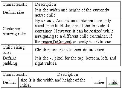 (accordion headers), which a user uses to navigate between the children. Accordion does not extend the ViewStack container; however, it implements all the properties, methods, styles, and events of the ViewStack container, such as selectedlndex and selectedChild. An Accordion container has the following default sizing characteristics: Answer option A is incorrect. ViewStack is a container that contains other child containers stacked on top of each other like a deck of cards. It consists of a collection of child containers stacked on top of each other, where only one child at a time is visible.