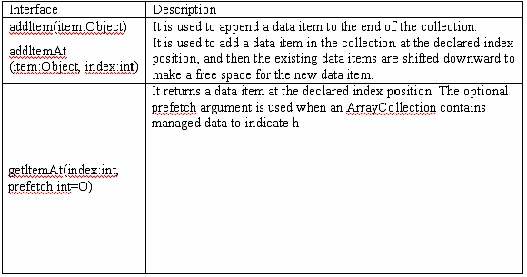 The ArrayCollection class interface can be used to get, add, and remove data at runtime. Following are the methods and properties of the ArrayCollection to access data at runtime:
