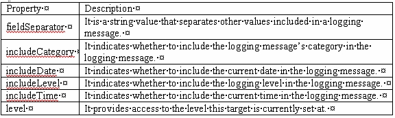 When a user uses the TraceTarget class, the output of the Logging API works in the manner as the output created with the trace() method. The TraceTarget class supports these properties: