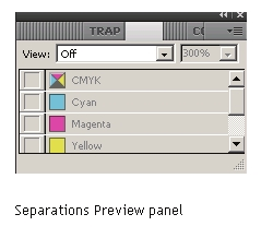 The Separations Preview panel is used to preview color separations on monitor before printing to avoid unexpected spot colors and unwanted overprinting. The Separations Preview panel allows a user to easily turn colors on and off so that it can be seen how blending, transparency, and overprinting will appear in color separated output. The Separations Preview panel can be displayed by choosing Window > Out put > Separations Preview or pressing Shift+F6.