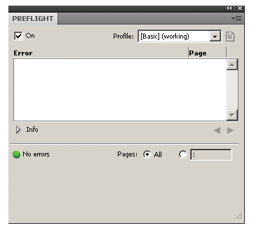 Answer B is incorrect. The Preflight panel is a feature of InDesign CS5 that warns of the problems that could prevent a document or book from printing or outputting as expected while a document is being edited. These problems include missing files or fonts, low-resolution images, overset text, and a number of other conditions. The preflight settings can be configured to define which conditions are detected. These preflight settings are stored in preflight profiles for easy reuse. To open the Preflight panel, choose Window > Output > Preflight, and double-click the Preflight icon at the bottom of the document window. The Preflight icon is green if no errors are detected or red if errors are detected. The Preflight panel is shown in the image below.