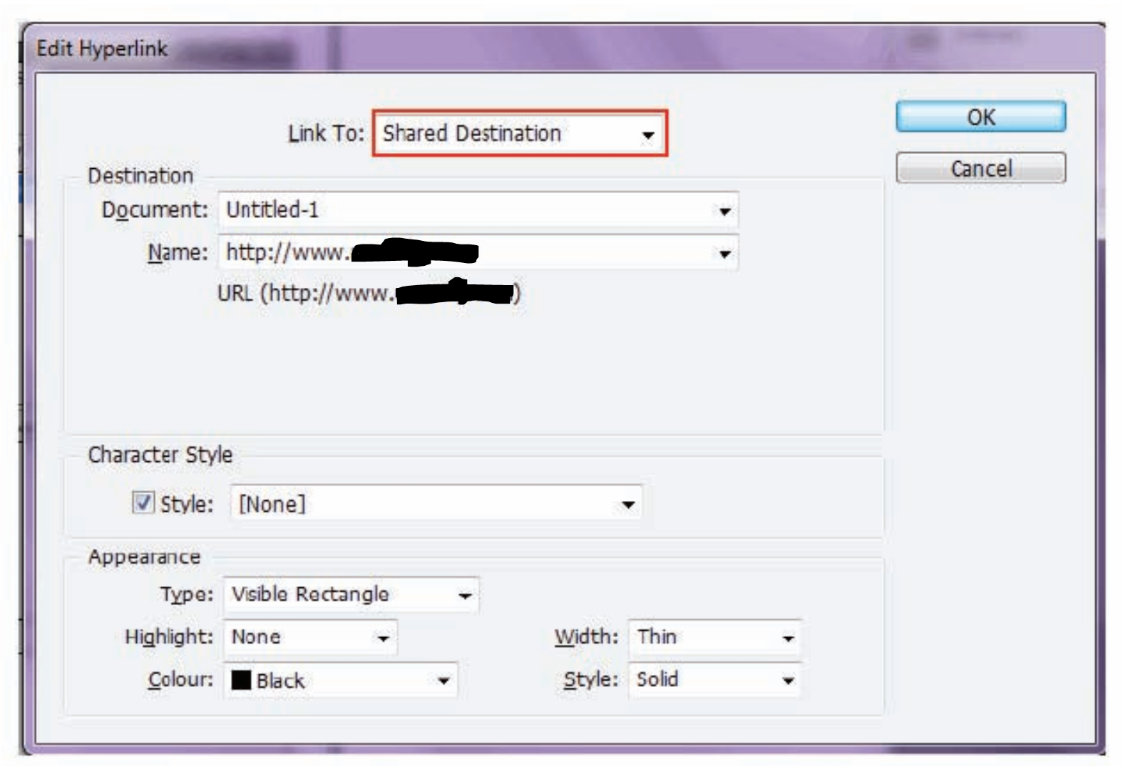 If a URL hyperlink is not working in an exported PDF, there may be a problem with the hyperlink being a Shared Destination. Double-click the hyperlink in the Hyperlinks panel, choose the URL from the Link To menu, deselect Shared Hyperlink Destination, and click OK as shown in the following diagram.