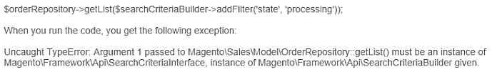 2. Change the getList parameter to: $searchCriteraBuilder->addFilter(`state','processing')->create()