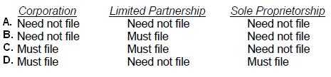 Choice "c" is correct. A sole proprietorship can be formed without filing with the state. Formation of either a corporation or a limited partnership requires a filing. Choices "a", "b", and "d" are incorrect per the Explanation above.