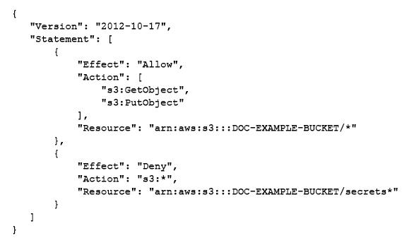 3. Access on all objects in the “DOC-EXAMPLE-BUCKET” bucket along with access to all S3 actions for objects in the “DOC-EXAMPLE-BUCKET” bucket that start with “secrets”