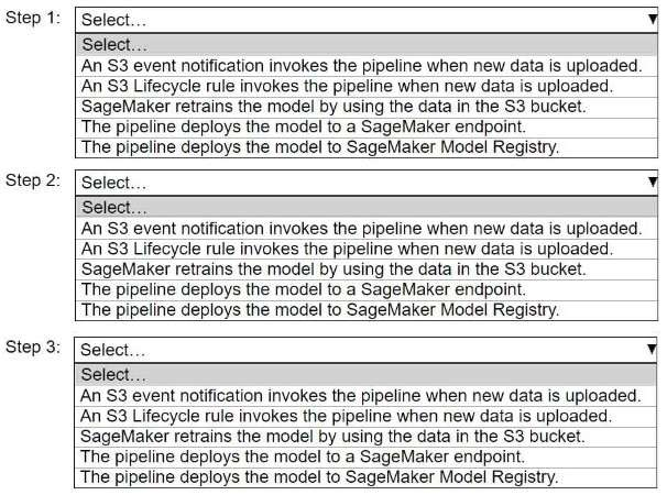 8. SageMaker retrains the model by using the data in the S3 bucket. The pipeline should include a step to retrain the ML model using the new data in the S3 bucket.
