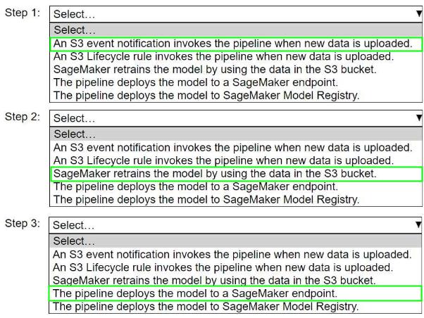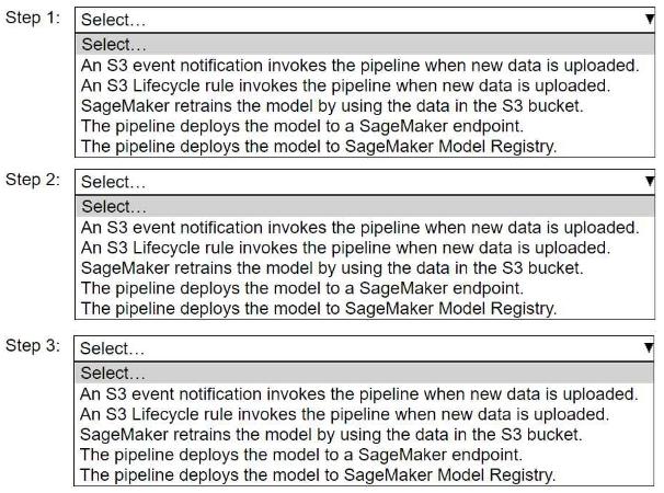 A company wants to host an ML model on Amazon SageMaker. An ML engineer is configuring a continuous integration and continuous delivery (Cl/CD) pipeline in AWS CodePipeline to deploy the model. The pipeline must run automatically when new training data for the model is uploaded to an Amazon S3 bucket.