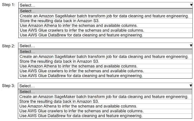 · Use Amazon Athena to infer the schemas and available columns. · Use AWS Glue crawlers to infer the schemas and available columns. · Use AWS Glue DataBrew for data cleaning and feature engineering.