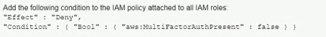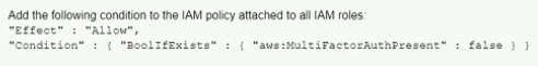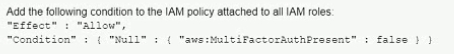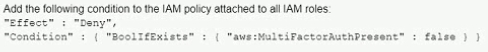 A company has an IAM account and allows a third-party contractor who uses another IAM account, to assume certain IAM roles. The company wants to ensure that IAM roles can be assumed by the contractor only if the contractor has multi-factor authentication enabled on their IAM user accounts