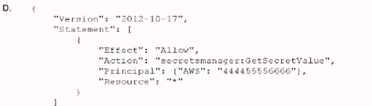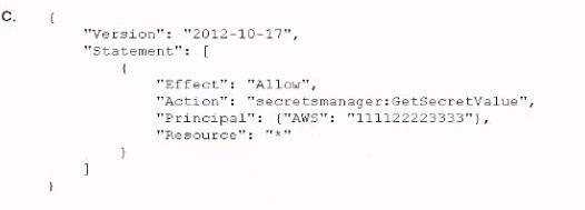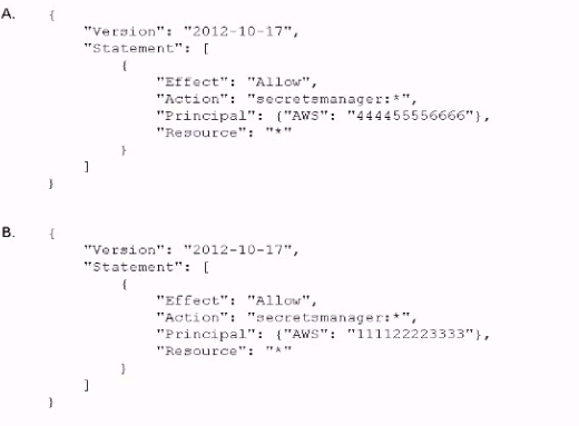 An company is using IAM Secrets Manager to store secrets that are encrypted using a CMK and are stored in the security account 111122223333. One of the company's production accounts. 444455556666, must to retrieve the secret values from the security account 111122223333. A security engineer needs to apply a policy to the secret in the security account based on least privilege access so the production account can retrieve the secret value only.