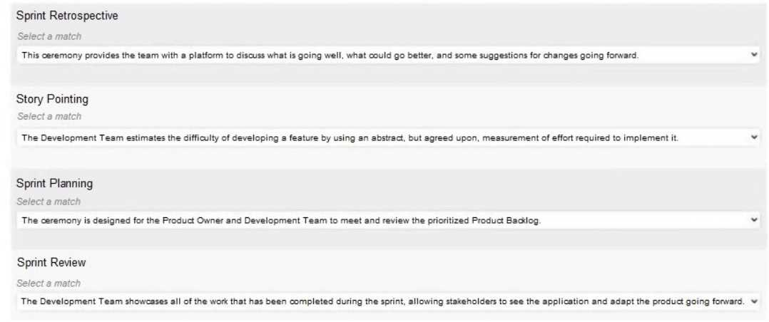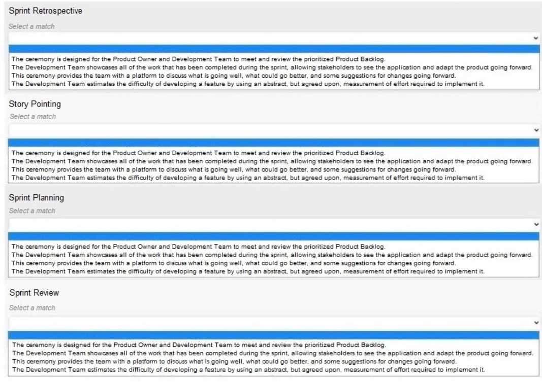 Match each sprint ceremony to its appropriate objective. Each objective may be used once, more than once, or not at all.