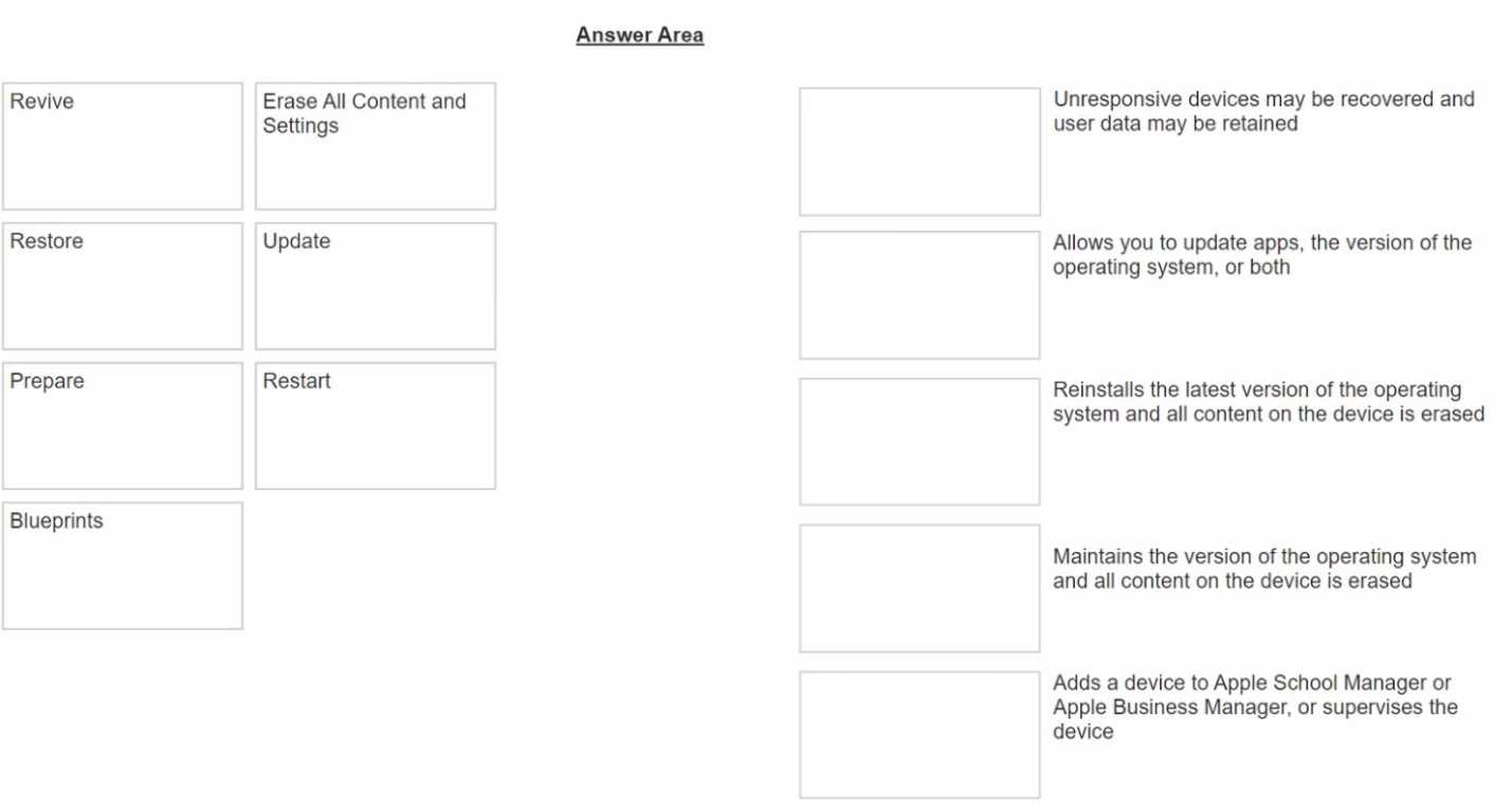 Match the Apple Configurator actions on the left to the descriptions on the right by dragging the responses to the correct target areas. Responses may be used once, more than once, or not at all.