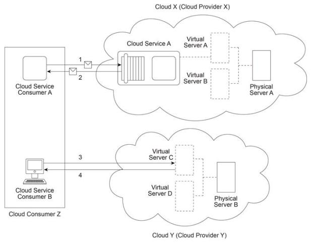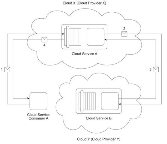 Cloud Service Consumer A invokes Cloud Service A from Cloud X (owned by Cloud Provider X) (1). To fulfill the request from Cloud Service Consumer A, Cloud Service A needs to invoke Cloud Service B that resides on Cloud Y (owned by Cloud Provider Y) (2). After completing its processing, Cloud Service B sends a response to Cloud Service A (3). Cloud Service A verifies the response and then finally sends its response to Cloud Service Consumer A (4).
