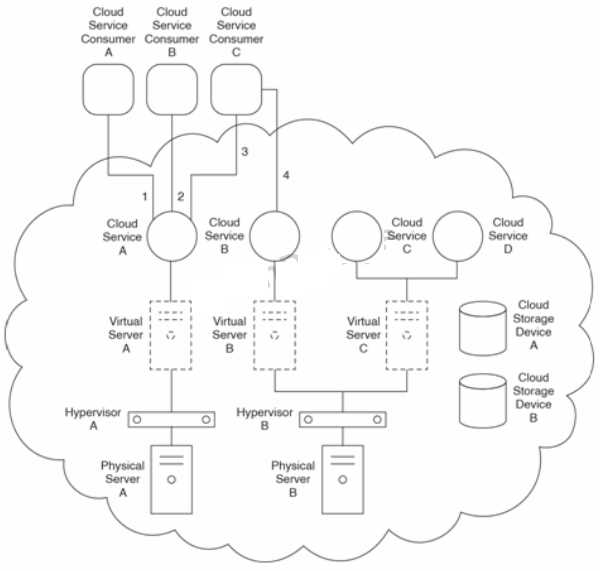Cloud Sen/ice A is hosted by Virtual Server A, which is hosted by Hypervisor A on Physical Server A. Cloud Service B is hosted by Virtual Server B. Virtual Server C hosts Cloud Services C and D. Virtual Server B and Virtual Server C are hosted by Hypervisor B on Physical Server B. Cloud Service Consumer A accesses Cloud Service A (1). Cloud Service Consumer B accesses Cloud Service A (2). Cloud Service Consumer C accesses Cloud Service A (3) and then accesses Cloud Service B (4).