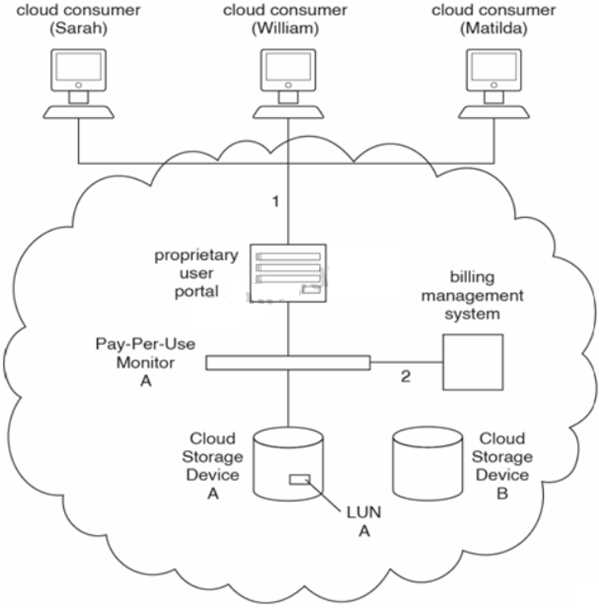Three different cloud consumers (Sarah. William, Matilda) access Cloud Storage Device A to upload data for backup purposes (1). These three cloud consumers belong to different departments within the same organization, and therefore all three share LUN A. Pay-Per-Use Monitor A collects the storage space data and forwards it to the billing management system (2). The cloud provider offers premium and discount storage plans. With the premium plan, the data stored on Cloud Storage Device A is also replicated to Cloud Storage Device B. With the discount plan, the data stored on Cloud Storage Device A is not replicated. Both plans are based on fixed disk storage allocation. The cost of the premium plan is $5 per week for every GB of storage space and the cost of the discount plan is $2 per week for every GB of storage space. The SLA from the cloud provider guarantees availability of 97% for access to Cloud Storage Device A. The three cloud consumers use Cloud Storage Device A as follows: