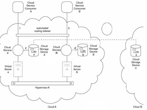Cloud Service A is hosted by Virtual Server A. Cloud Storage Device A contains LUN A. Cloud Storage Device A is a multi-tiered cloud storage device with different types of disk groups that perform at different levels. LUN A is located in the disk group with the highest performance level. Cloud Service B is hosted by Virtual Server B. Virtual Servers A and B are hosted by HypervisorA, which is installed on a physical server (not shown) that resides in Cloud A. A redundant implementation of LUN A is replicated synchronously to Cloud Storage Device C. Cloud Storage Device C does not support multiple types of disk groups and resides in Cloud B, which is located in a different geographic region than Cloud A. Requests that cloud service consumers send to Cloud Services A and B are intercepted by an automated scaling listener responsible for initiating scaling activities.