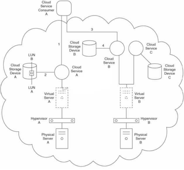 Cloud Service A requires access to Cloud Storage Device A, which contains LUNs A and B. Cloud Service A is hosted by Virtual Server A, which resides on Hypervisor A on Physical Server A. Virtual Server B hosts Cloud Service B and Cloud Service C. Cloud Service Consumer A accesses Cloud Service A (1), which then accesses LUN A or B on Cloud Storage Device A (2). After receiving the requested data from Cloud Service A, Cloud Service Consumer A forwards the data to Cloud Service B (3), which then writes it to Cloud Storage Device B (4).