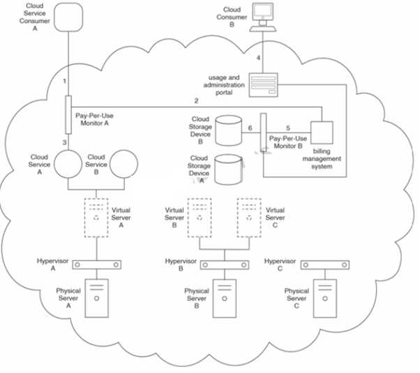 Cloud Service Consumer A sends a request to Cloud Service A that is intercepted by Pay-Per-Use Monitor A (1), which collects billing-related usage data that is later forwarded to the billing management system (2). Cloud Service A receives and processes the request (3). Cloud Consumer B accesses the usage and administration portal (4) to access data on Cloud Storage Device B. Pay-Per-Use Monitor B intercepts the data access to collect and forward billing-related usage data to the billing management system (5). Cloud Storage Device B processes the data access request from Cloud Consumer B (6).