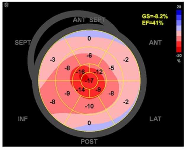 The first image shows a bullseye plot of global longitudinal strain (GLS) with marked reduction in strain values (less negative numbers) most prominently in the apical segments (central red zone), with an overall GLS of -8.2% (normal is about -20%) and a reduced ejection fraction of 41%. This pattern is characteristic of Takotsubo cardiomyopathy, which typically demonstrates regional wall motion abnormalities that predominantly involve the apex and mid segments of the left ventricle with basal sparing.