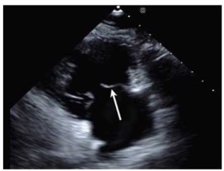 The echocardiographic image is a four-chamber view focusing on the mitral valve apparatus. The arrow points to the anterior leaflet of the mitral valve, which is typically more prominent, triangular in shape, and located adjacent to the aortic valve in the left ventricular outflow tract region.