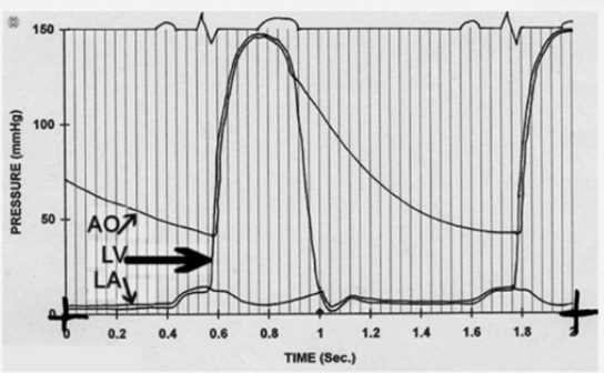 The pressure tracing shows left atrial (LA), left ventricular (LV), and aortic (AO) pressures over time. The key feature is the large pressure gradient between the LA and LV during diastole (arrow pointing at early diastolic phase), where the LA pressure is elevated and there is a delayed, gradual rise in LV pressure during diastolic filling. This finding is typical of mitral stenosis, where obstruction at the mitral valve causes increased LA pressure and a pressure gradient between LA and LV during diastole.