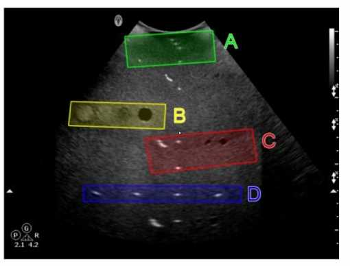 In the tissue-mimicking phantom image, Option D (blue box) is used to evaluate transverse distance measurement accuracy. Phantoms are used to simulate human tissue and provide a standardized way to test the accuracy and precision of ultrasound machines. Transverse distance measurement accuracy is assessed by measuring known distances between targets in the phantom. The blue box (Option D) typically contains targets positioned to specifically test the accuracy of transverse measurements, ensuring that the ultrasound system provides reliable and precise distance readings.