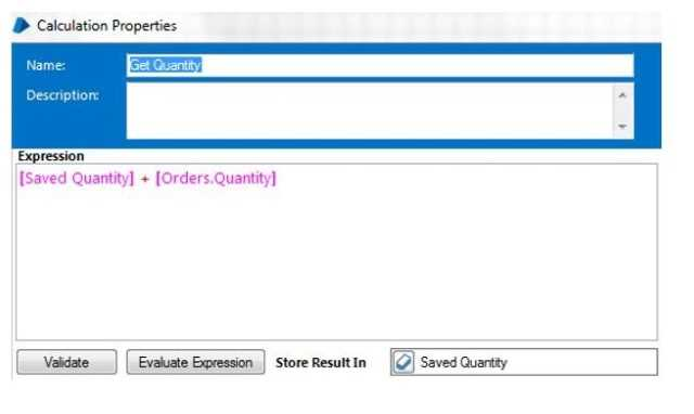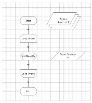 The Saved Quantity Data Item is configured as a number with the initial value 0. The Loop Orders stage is configured to loop though the Orders collection.