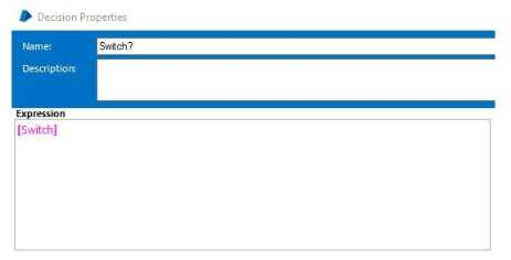 4. When the configuration is run in Control Room, it will fail with an internal error on the first execution of the 'Switch?' stage with the error: Decision did not result in a yes/no