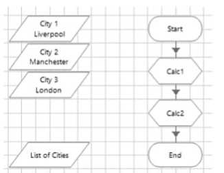 The data item 'City V is configured as a Text data item and has an initial value of 'LiverpooI'. The data item 'City 2' is configured as a Text data item and has an initial value of 'Manchester'. The data item 'City 3* is configured as a Text data item and has an initial value of 'London'. The data item 'List of Cities' is configured as a Text data item and has no initial value.