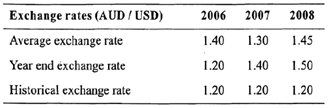 Gary Smith, CFA, has been hired lo analyze a specialty tool and machinery manufacturer, Whitmore Corporation (WMC). WMC is a leading producer of specialty machinery in the United States. At the end of 2006, WMC purchased York Tool Company (YTC), an Australian firm in a similar line of business. YTC has partially integrated its marketing functions within WMC but still maintains control of its operations and secures its own financing. Following is a summary of the income statement and balance sheet for YTC (in millions of Australian dollars - AUD) for the past three years as well as exchange rate data over the same period.