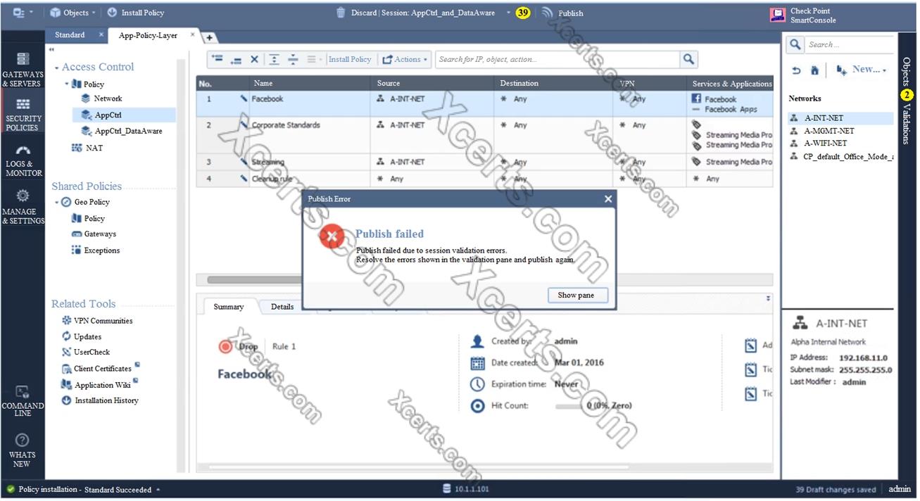 Administrator Kofi has just made some changes on his Management Server and then clicks on the Publish button in SmartConsole but then gets the error message shown in the screenshot below.