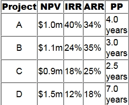 Four mutually exclusive projects have been appraised as follows using net present value (NPV), internal rate of return (IRR), accounting rate of return (ARR) and payback period (PP).