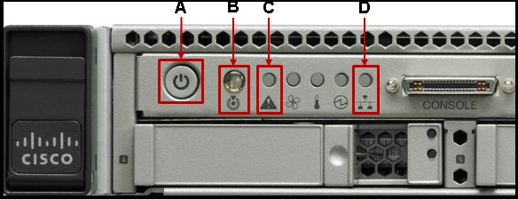 3. A is system status LED; B is network link activity LED; C is power button and power status LED; D is identification button and LED.