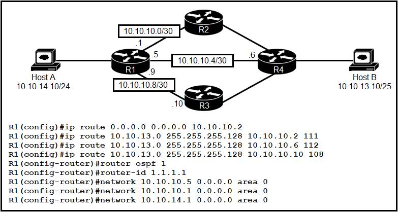 Refer to the exhibit. R1 has just received a packet from host A that is destined to host B. Which route in the routing table is used by R1 to reach host B?