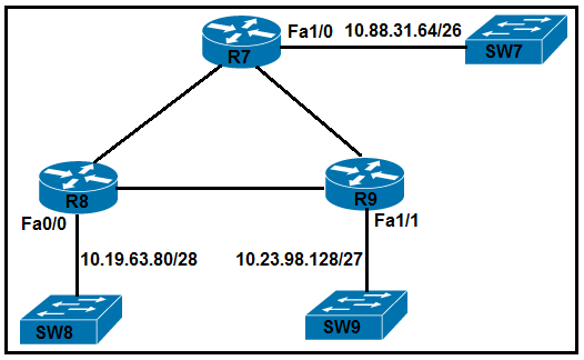 - R7# interface FastEthernet1/0 ip address 10.88.31.127 255.255.255.192 R8# interface FastEthernet0/0 ip address 10.19.63.95 255.255.255.240 R9# interface FastEthernet1/1 ip address 10.23.98.159 255.255.255.224