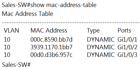 - Insert the source MAC address and port into the forwarding table and forward the frame to Sales-1.