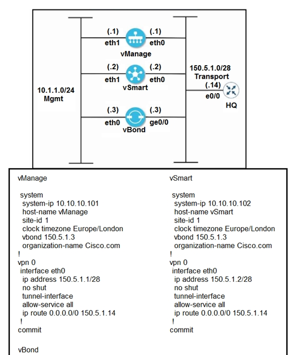 Refer to the exhibit. An engineer is troubleshooting an issue where vManage and vSmart have a problem establishing a connection to vBond. Which action fixes the issue?