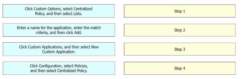An engineer signs in to Cisco vManage and needs to configure a custom application with a Cisco SD-WAN centralized policy. Drag and drop the steps from the left onto the order on the right to complete the configuration.