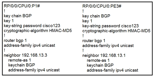 Refer to the exhibit. P1 and PE3 Cisco IOS XR routers are directly connected and have this configuration applied. The BGP session is not coming up. Assume that there is no IP reachability problem and both routers can open tcp port 179 to each other. Which action fixes the issue?