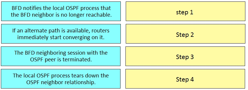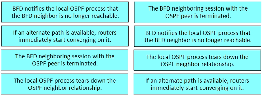 A failure occurs on the network between two BFD and OSPF neighbors. Drag and drop the protocol actions from the left into the correct order on the right.
