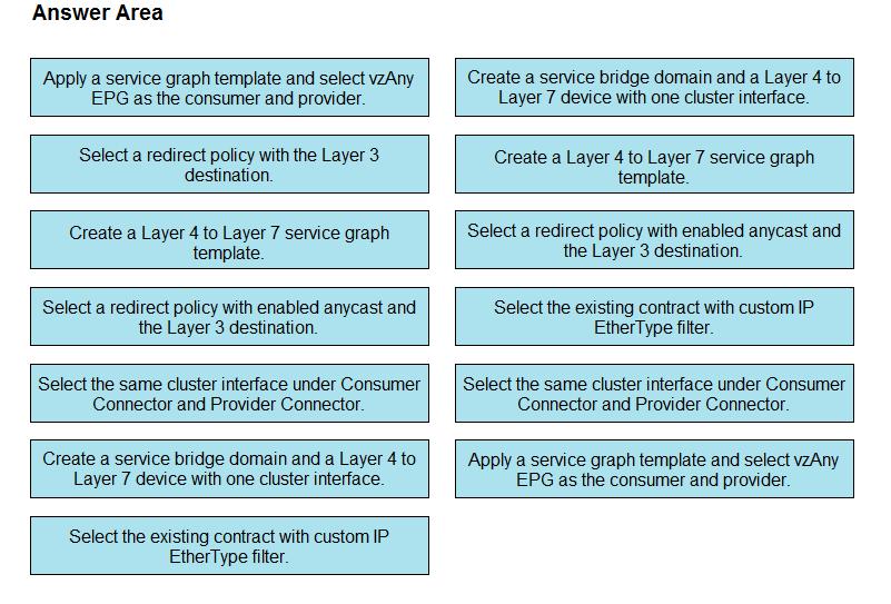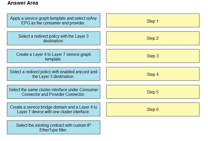 Refer to the exhibit. A Cisco ACI fabric is newly deployed, and the security team requires more visibility of all inter EPG traffic flows. All traffic in a VRF must be forwarded to an existing firewall pair. During failover, the standby firewall must continue to use the same IP and MAC as the primary firewall. Drag and drop the steps from the left into the implementation order on the right to configure the service graph that meets the requirements. (Not all steps are used.)
