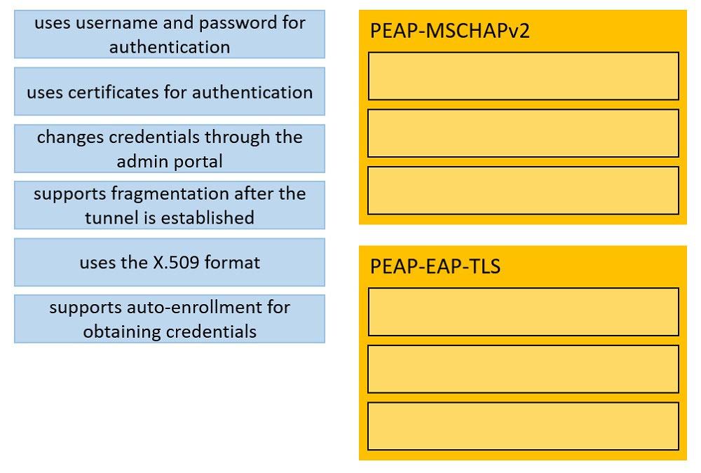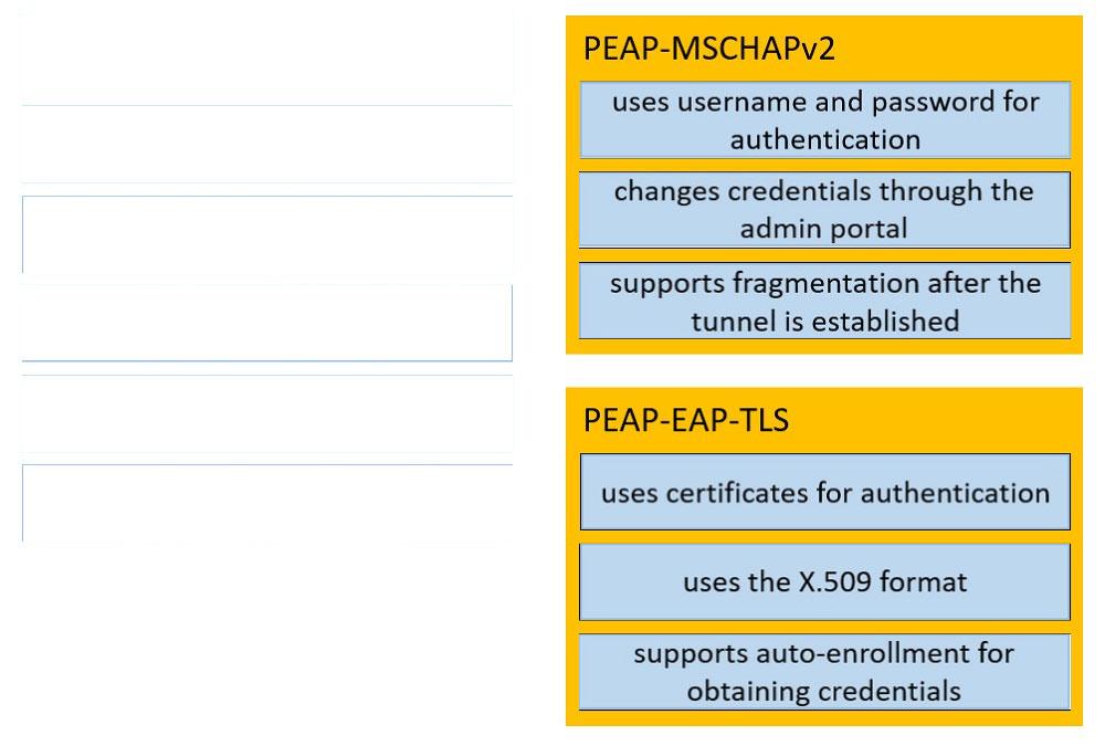 An organization wants to implement 802.1X and is debating whether to use PEAP-MSCHAPv2 or PEAP-EAP-TLS for authentication. Drag the characteristics on the left to the corresponding protocol on the right.