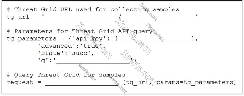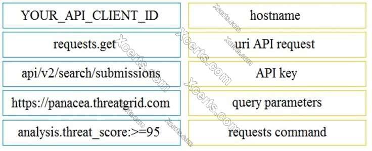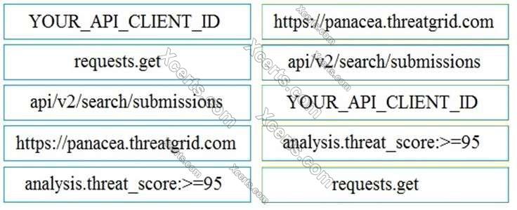 Drag and drop the elements from the left onto the script on the right that queries Cisco ThreatGRID for indications of compromise.