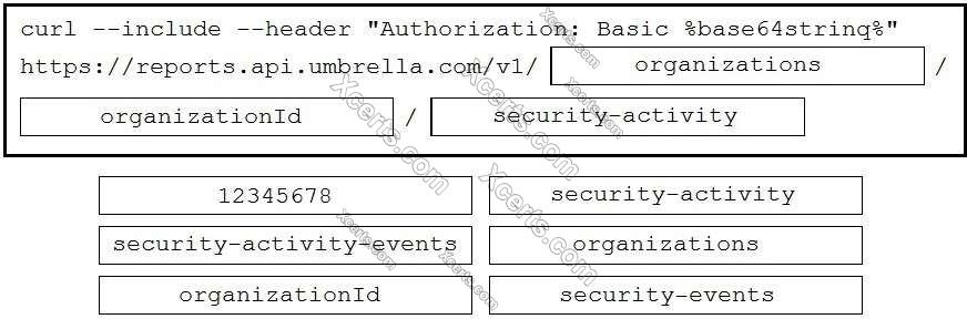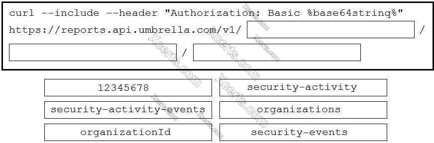 Drag and drop the code to complete the curl query to the Umbrella Reporting API that provides a detailed report of blocked security activity events from the organization with an organizationId of "12345678" for the last 24 hours. Not all options are used.