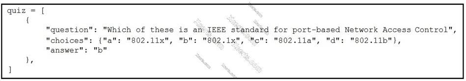 3. print(quiz[0]['choices']['b']['802.1x'])