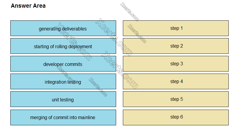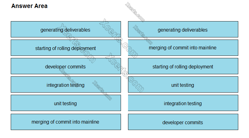Drag and drop the operations from the left into the correct order on the right when using CI/CD, assuming that there are no failures or conflicts.