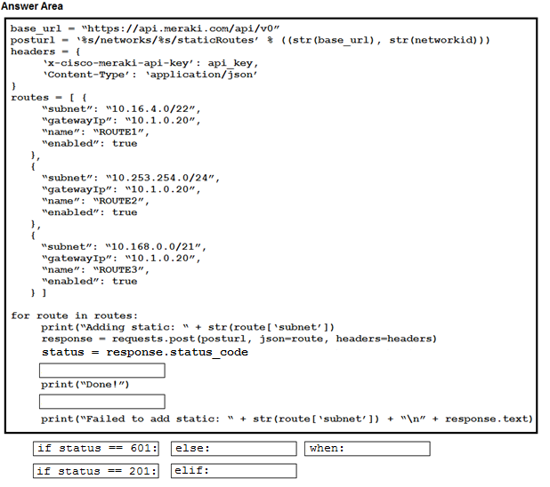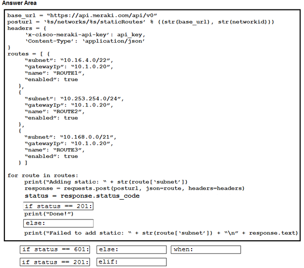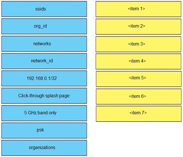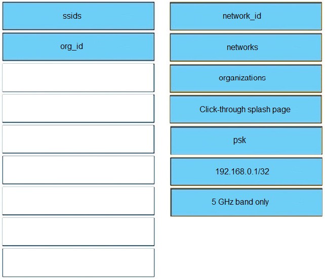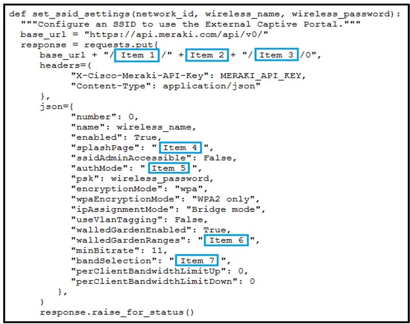 Refer to the exhibit above and click on the Meraki Resources tab in the top left corner to view Meraki documentation to help with this question. Drag and drop the parts of the Python code from the left onto the item numbers on the right that match the missing sections in the exhibit to enable an SSID. Not all code parts are used.